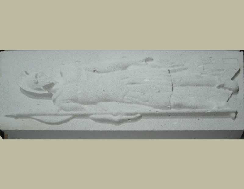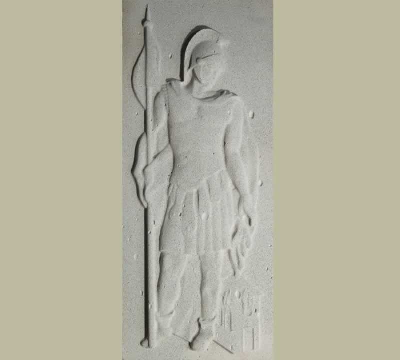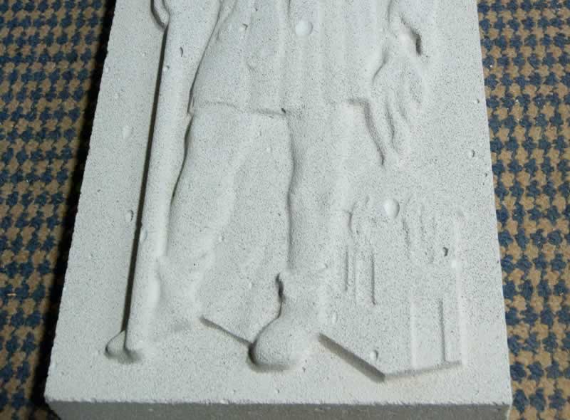 Der Heilige Florian in einem Ytong-Ziegel eingefräst als dekoratives Mauerelement.